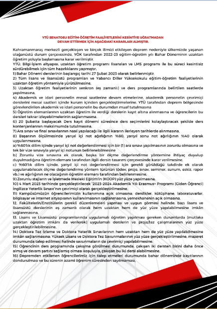 Yıldız Teknik Üniversitesi 2023/03 sayılı Üniversite Senato kararının 12. ve 13. maddelerine istinaden Mimarlık Fakültesi Dekanlığı olarak Fakültemiz bünyesindeki bölümlerin uygulamalı dersleri (proje, laboratuvar, atölye ve benzeri uygulamalı dersler) programda belirlenen saatlerde dersin akademisyeni tarafından okulumuzda çevrimiçi verilecek olup okula gelen öğrencilerimizin katılımına açıktır. Derslerle ilgili ayrıntılı açıklama Bölümler tarafından önümüzdeki hafta içinde yapılacaktır.